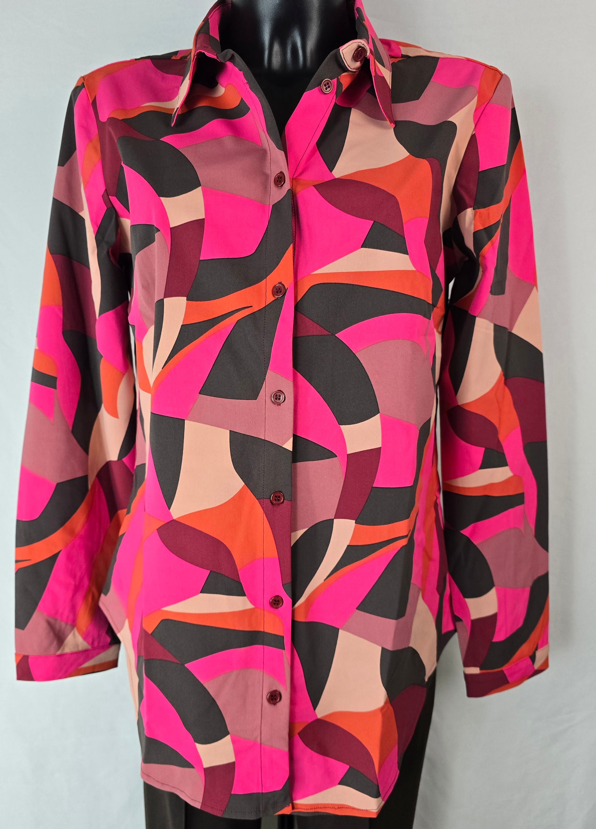 Geef je outfit een kleurrijke boost met deze stijlvolle retro blouse! De blouse heeft een levendige abstracte print in fuchsia, oranje, beige, bordeaux en zwart. Gemaakt van een soepele, lichtgewicht stof die comfortabel draagt en mooi valt.