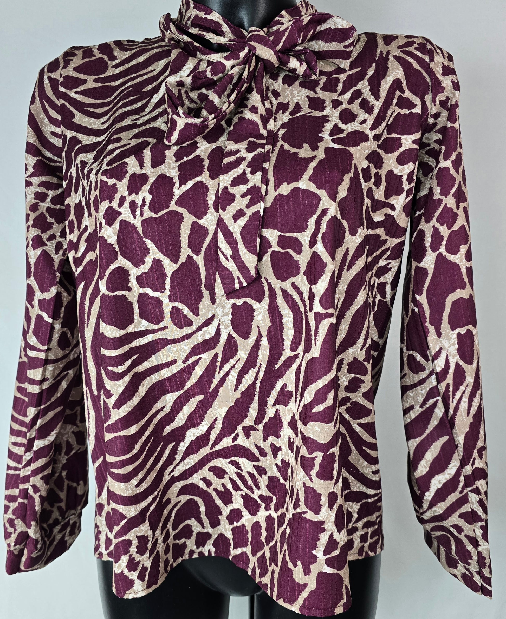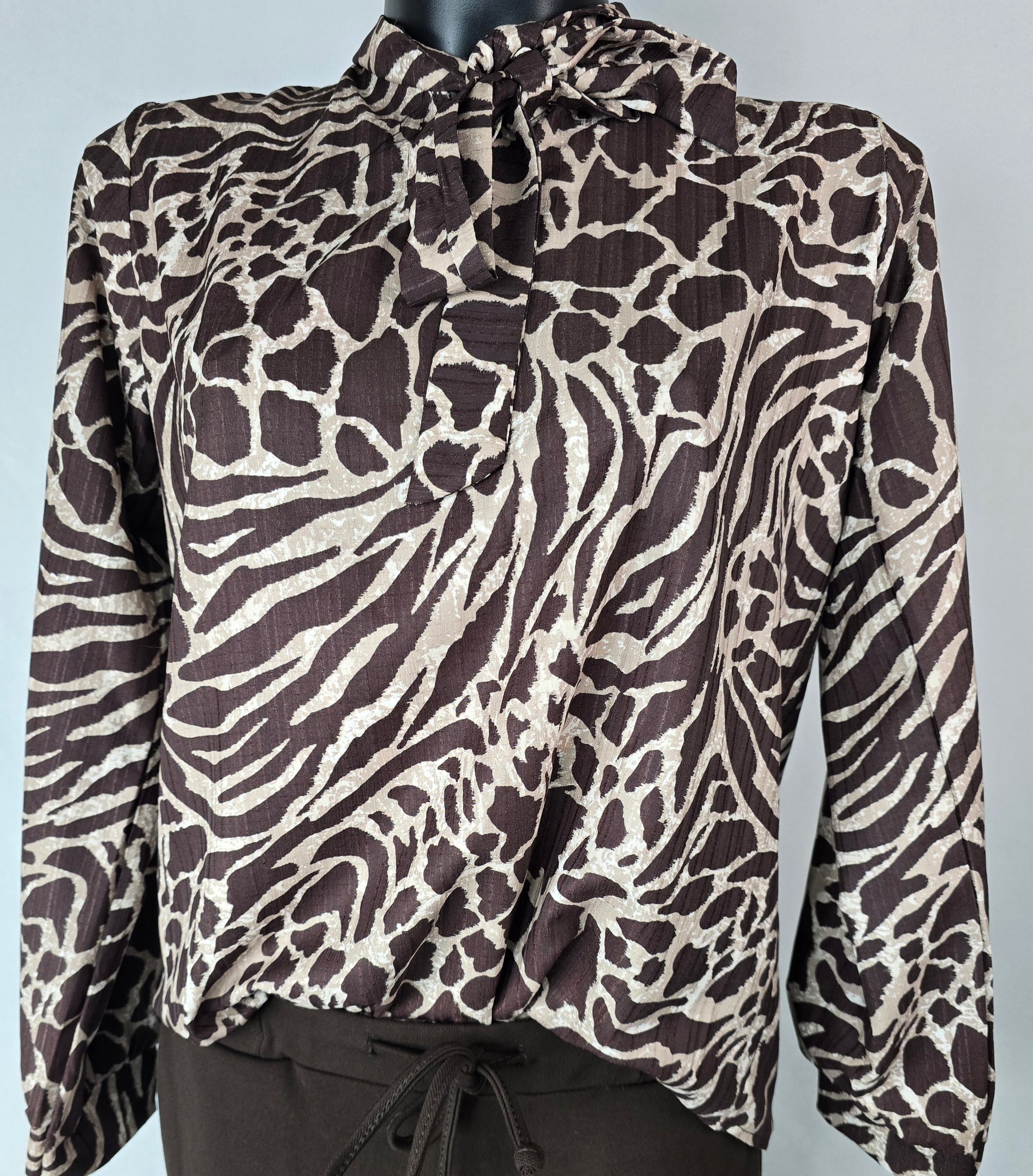 Deze elegante blouse met speelse dierenprint verspreide stijlvolle kleuren met een luchtige, soepelvallende stof. De opvallende sluiting aan de hals geeft een vrouwelijke touch, terwijl de subtiele glans en het ingewikkelde patroon zorgen voor een chique uitstraling. Perfect voor zowel casual als geklede looks.