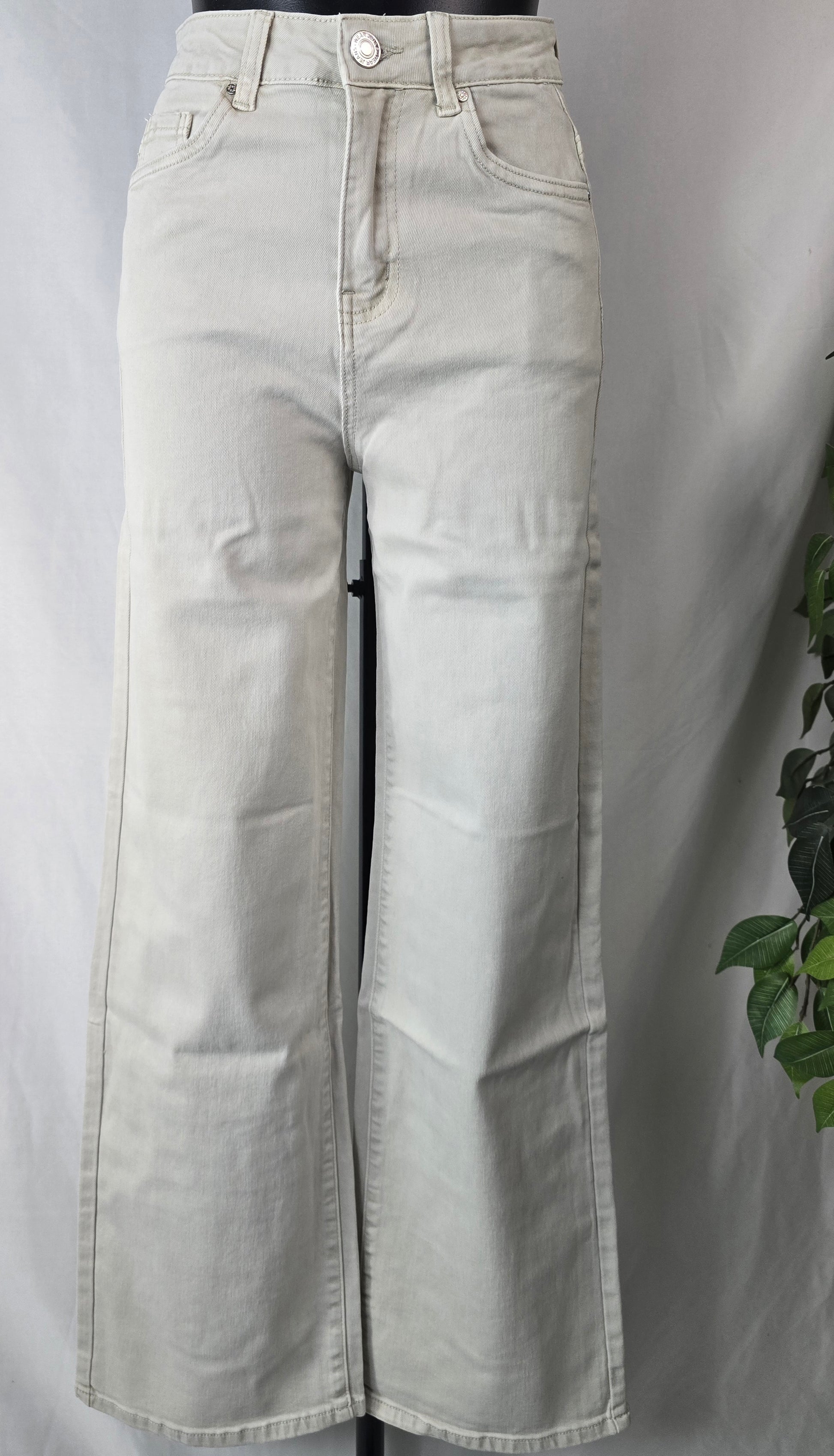 Deze elegante jeans met hoge taille in een zachte beige tint is een echte musthave voor een moderne en stijlvolle garderobe. De hoge taille zorgt voor een prachtig silhouet en een flatterende silhouet, terwijl de wijde pijpen een trendy en tijdloze uitstraling geven.