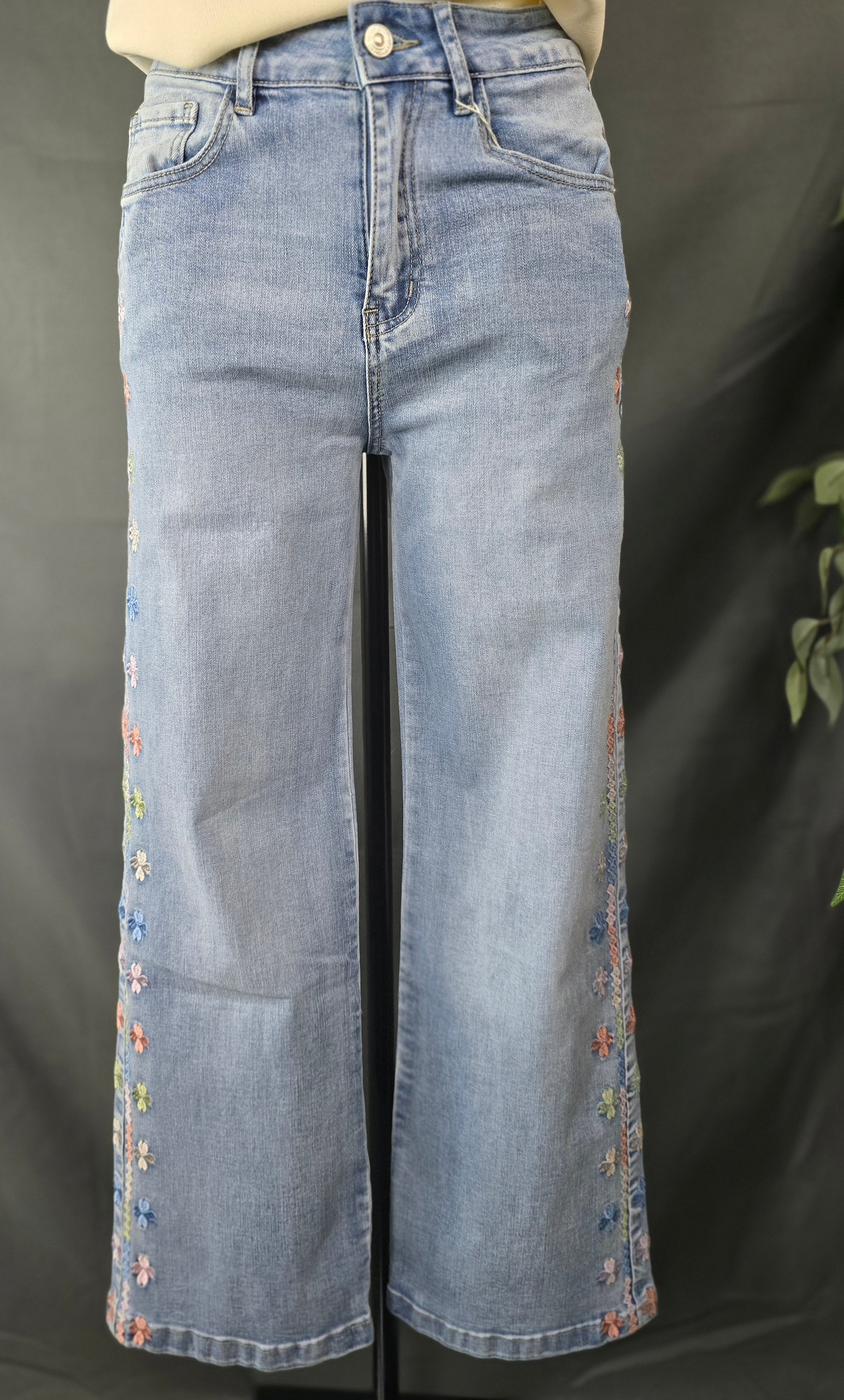 Deze lichtblauwe wide-leg jeans combineert een tijdloze denim look met speelse, geborduurde bloemetjes langs de zijkant van de pijpen. De zachte wassing zorgt voor een frisse uitstraling, terwijl het kleurrijke borduurwerk een subtiele, vrouwelijke touch geeft. Een perfecte statement jeans die je outfit meteen laat opvallen, zonder te overdrijven.