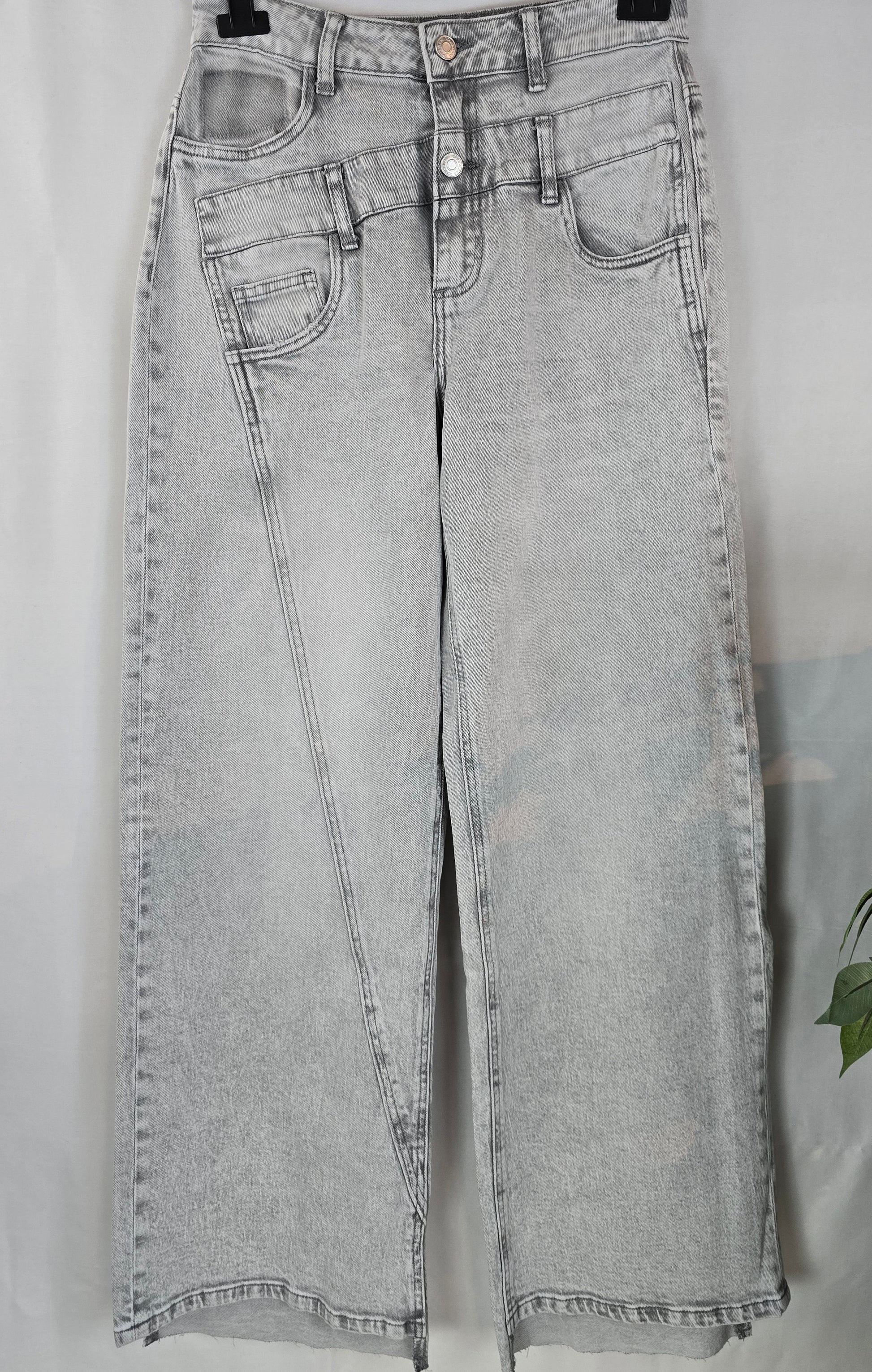 Deze moderne grijze jeans is een stoere wassing met een unieke twist. De opvallend schuine naden en speelse zakdetails geven de broek een eigentijdse, edgy uitstraling. De wijde pijpen vallen soepel en comfortabel, ideaal voor een trendy, casual look. Perfecte stijlen met sneakers, laarsjes of een stijlvolle blouse.