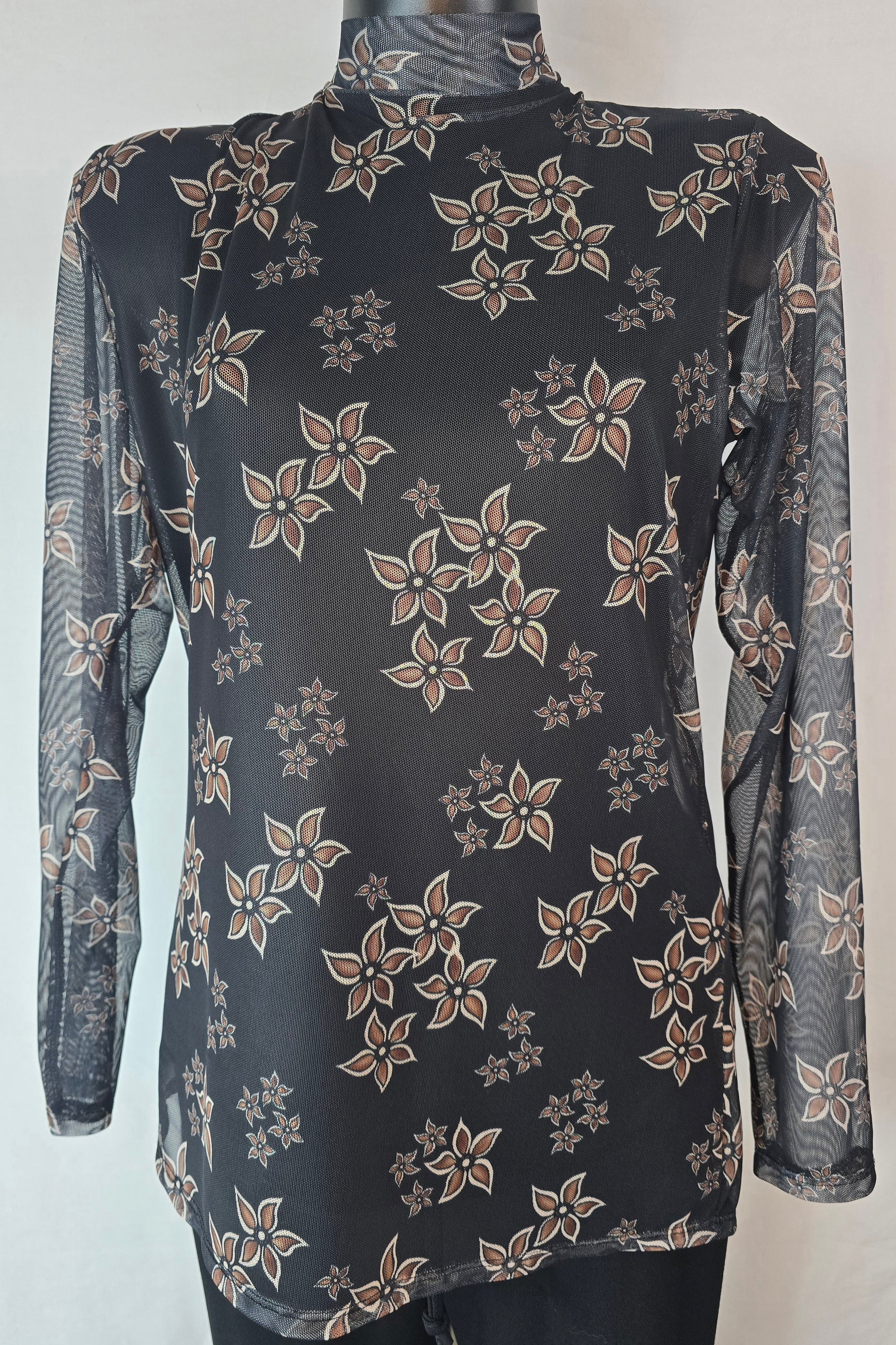 Deze stijlvolle navy en zwarte top is gemaakt van een lichte, semi-transparante mesh stof en valt soepel om het lichaam. De top heeft lange mouwen en een dubbele opstaande hals voor een mysterieuze uitstraling. Het bloemenmotief in zachte, contrasterende tinten geeft het geheel een vrouwelijke en moderne look.