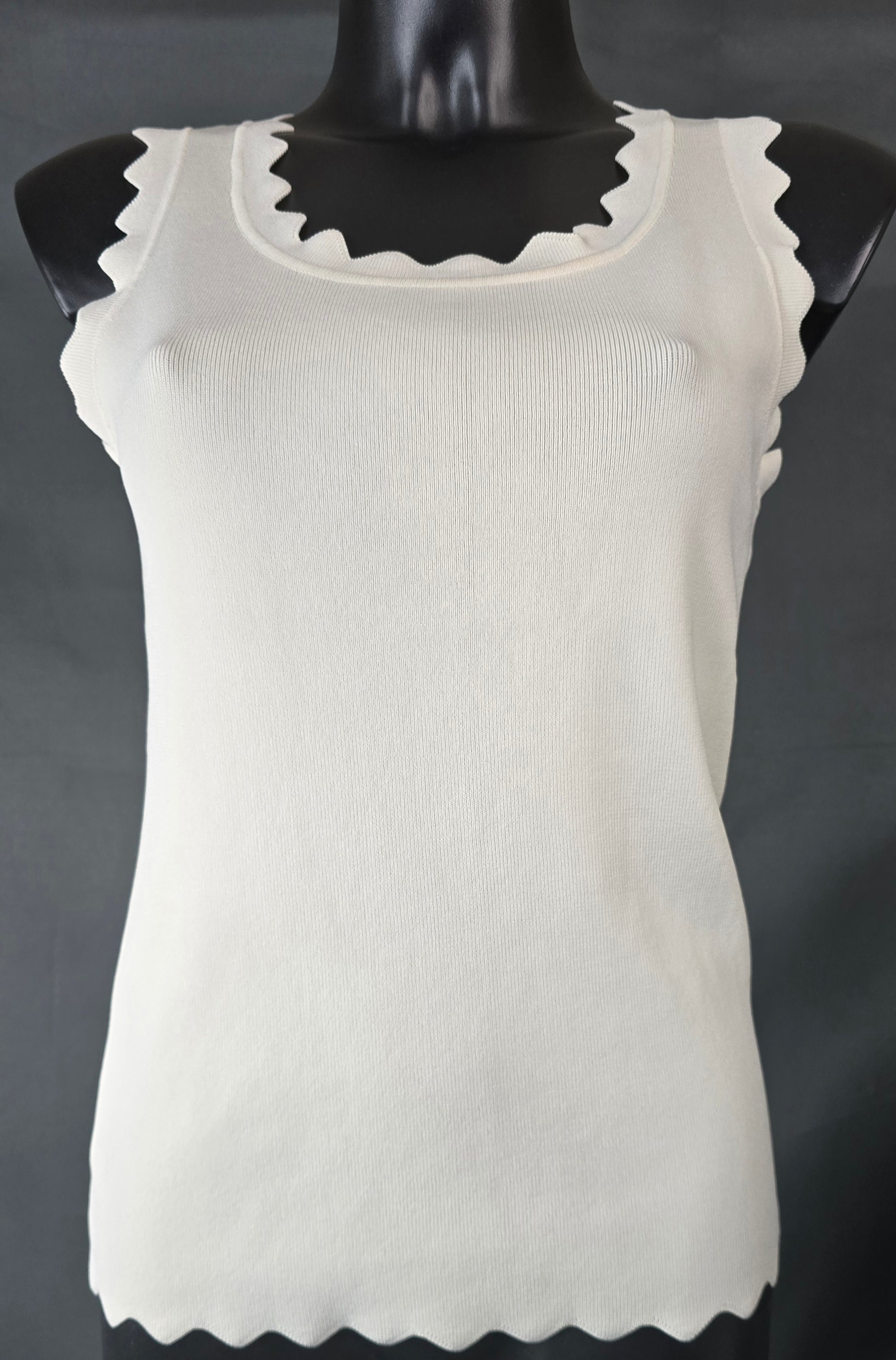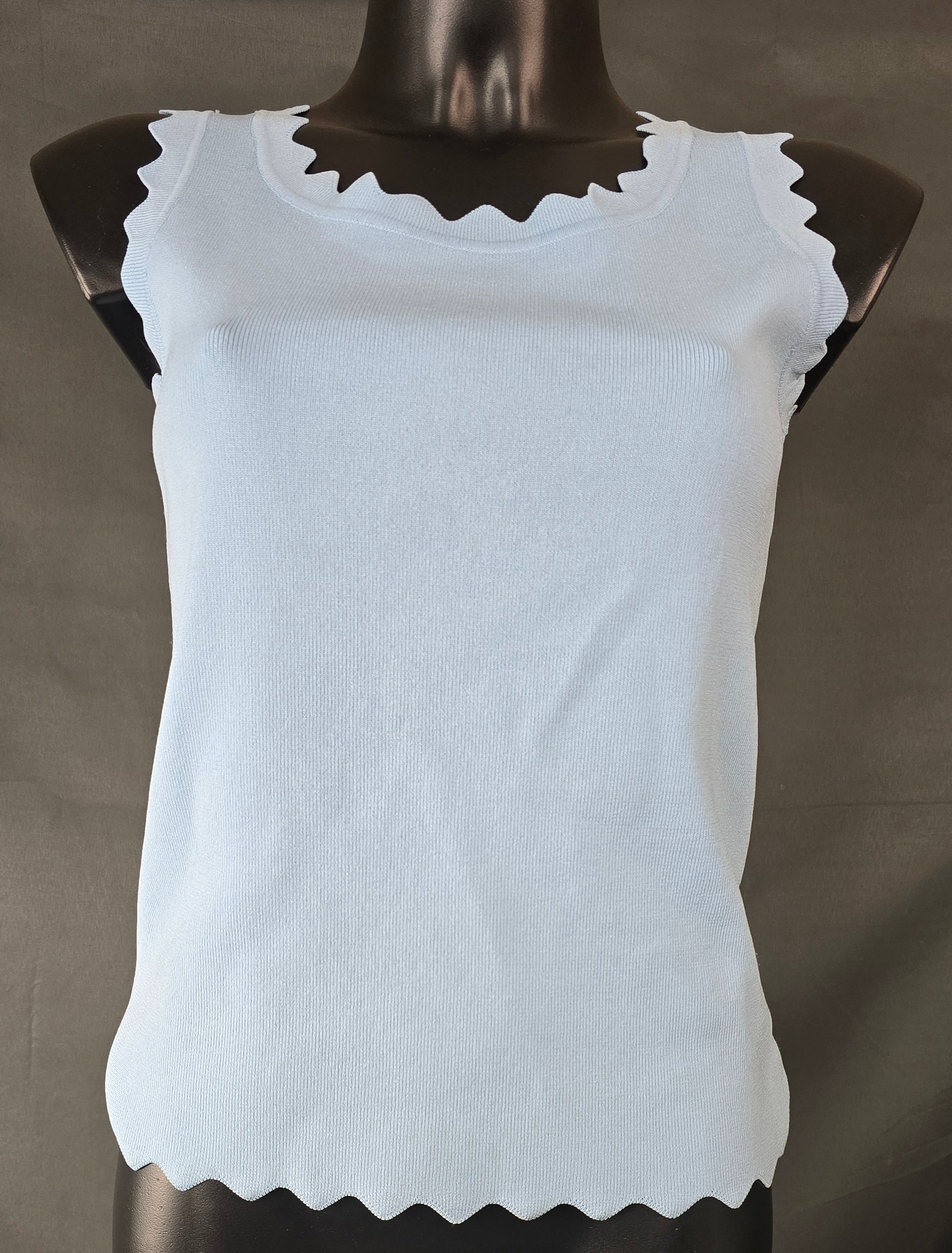 Deze lichtblauwe mouwloze top is een perfecte basic met een vrouwelijke twist. De zachte ribstructuur zorgt voor een comfortabele fit, terwijl de sierlijk afgewerkte golfrand langs de hals, armsgaten en zoom de top een speels en verfijnd detail geeft. Ideaal om solo te dragen op warme dagen of als basis onder een vestje, blazer of gilet.