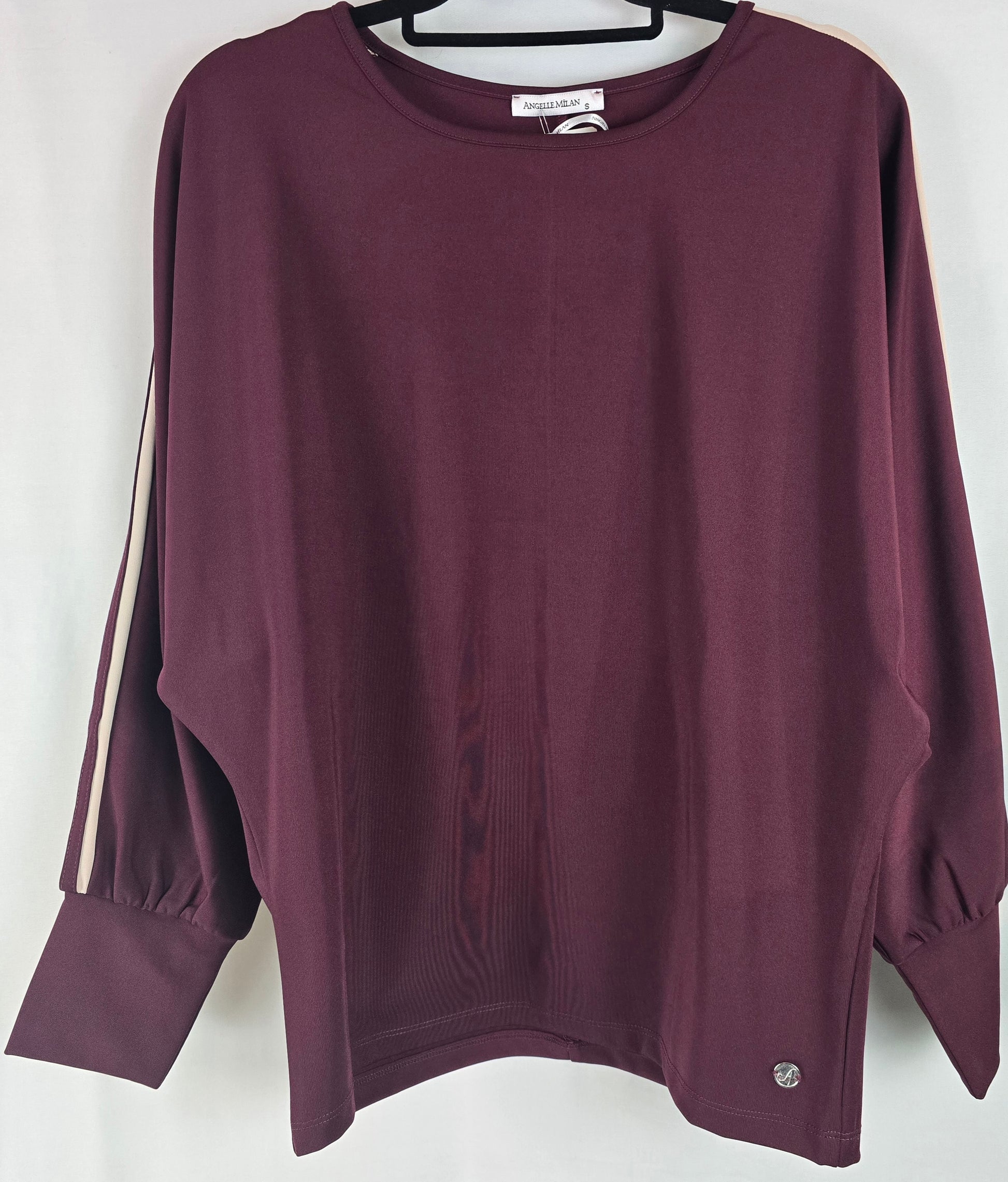 stijlvolle bordeaux top met ronde hals en sportieve biezen op de mouwen.