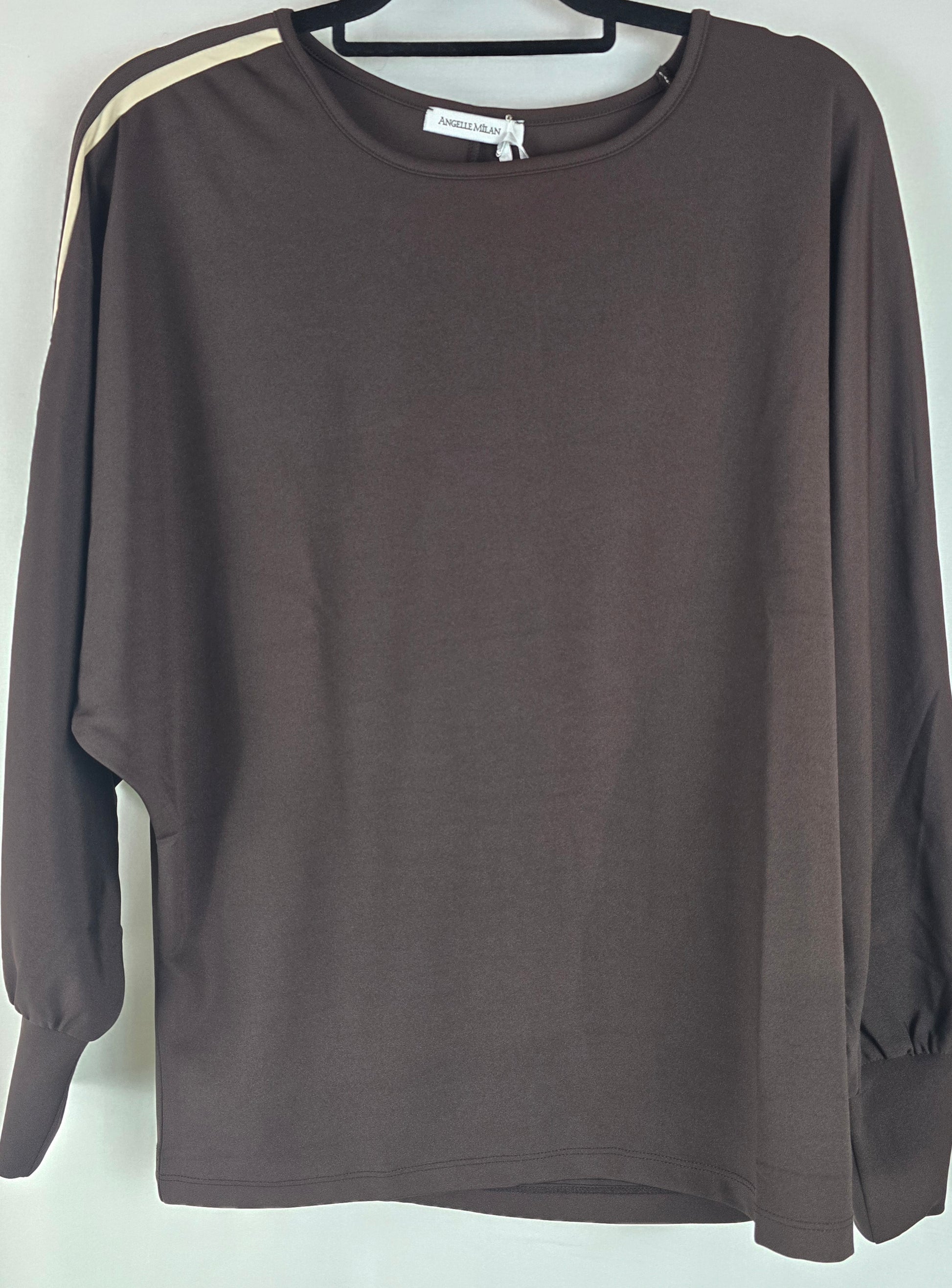 Deze comfortabele top heeft een losse pasvorm, brede manchetten en subtiele metalen details aan de zoom, perfect voor een casual maar verzorgde look.