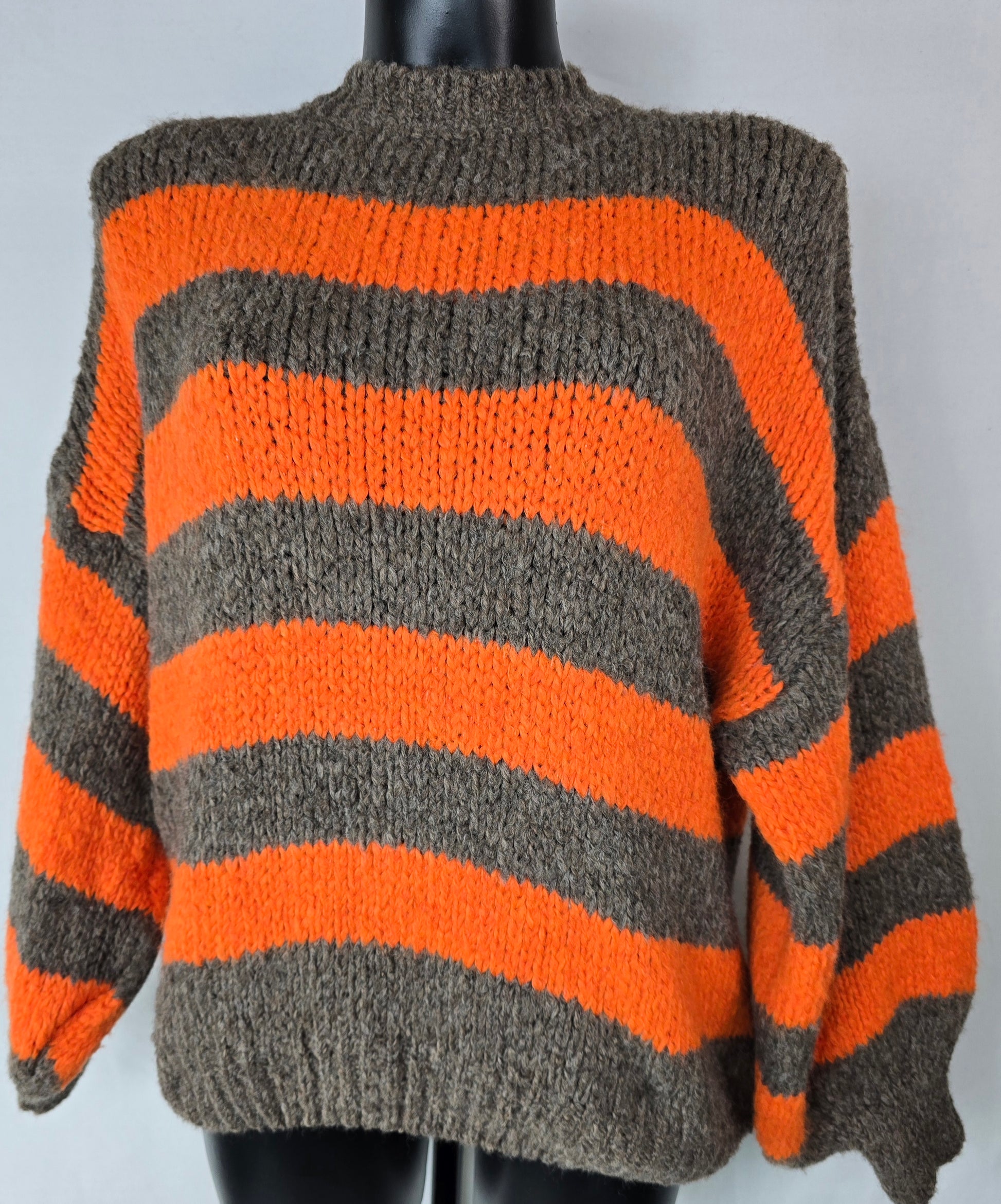 Deze warme en comfortabele gebreide trui is perfect voor koude dagen. De speelse combinatie van fel oranje en neutraal grijs geeft de trui een opvallende, moderne uitstraling. Dankzij het grof gebreide ontwerp voelt de trui heerlijk zacht en gezellig aan.