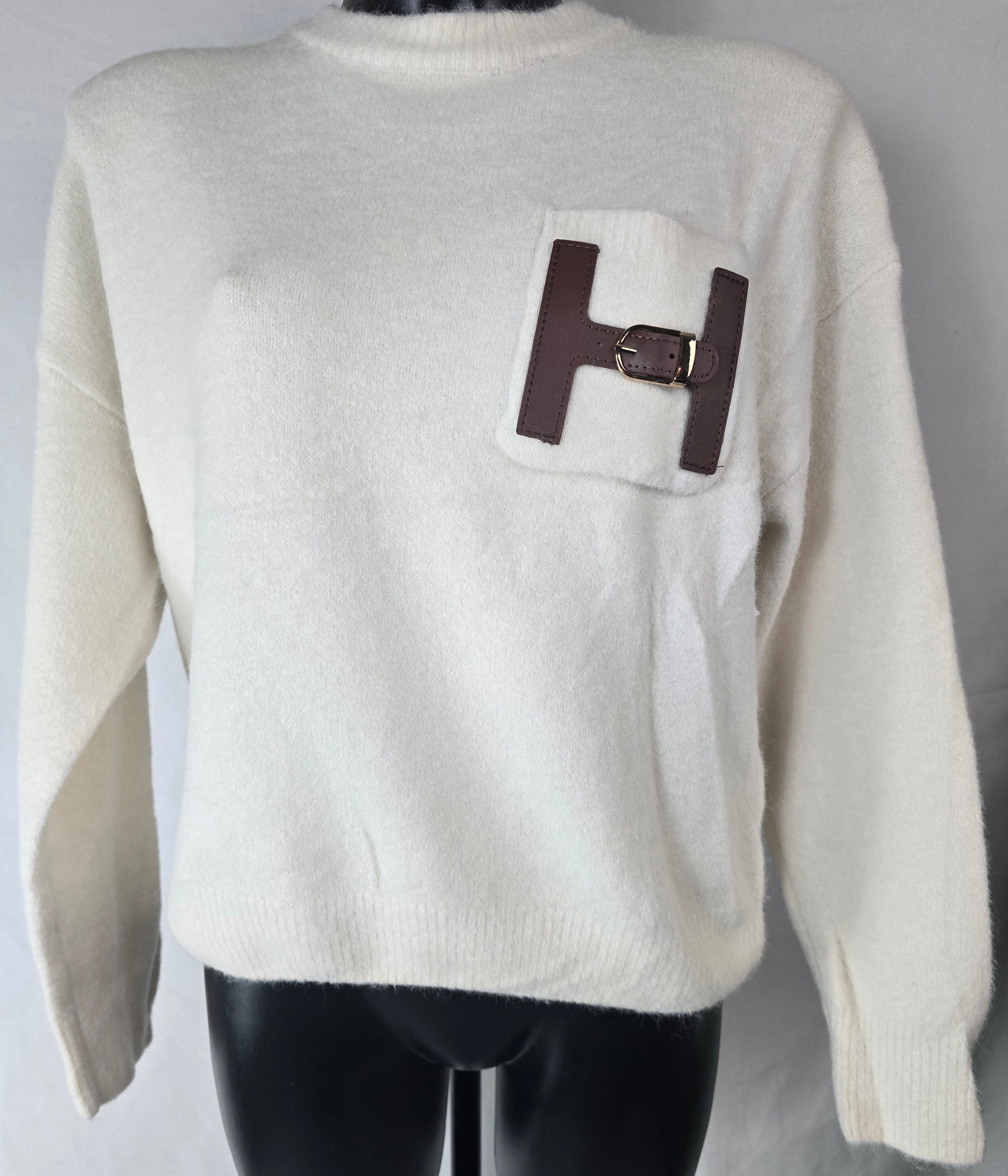 Zachte en comfortabele off-white trui met ronde hals en lange mouwen. Voorzien van een borstzak met een decoratief bruin lederen detail en goudkleurige gesp, wat zorgt voor een stijlvolle en luxe uitstraling. Makkelijk te combineren voor zowel casual als geklede looks.