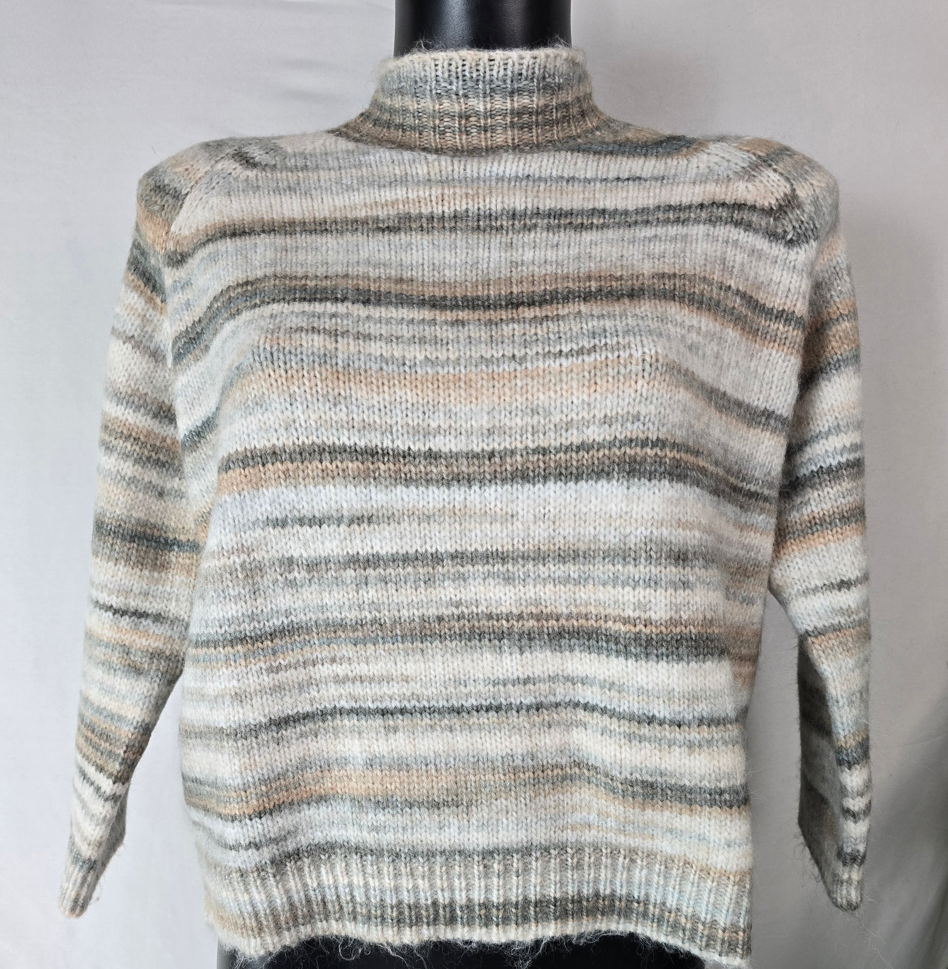 Deze prachtige samengestelde coltrui troost met een stijlvolle uitstraling. Het zachte, warme breisel voelt heerlijk aan op de huid en deze trui is perfect voor koude dagen. Het subtiele streeppatroon in neutrale tinten zoals beige, crème en grijs geeft de trui een rustige, elegante look die gemakkelijk te combineren is.